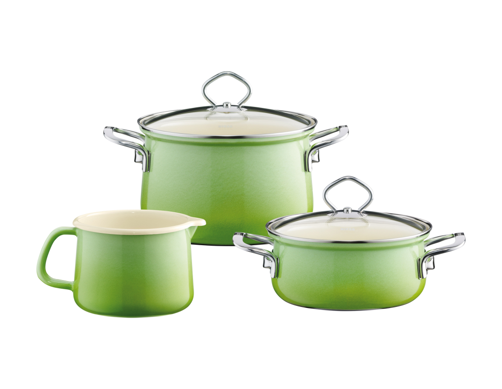 Der Farbton Smaragd ist meisterhaft emailliert in sanften Grün Schattierungen. Töpfe und Kasserollen sind mit starkem Stahl-Wärmespeicherboden, rostfreiem Schüttrand, Edelstahlgriffen und Glasdeckel ausgestattet.