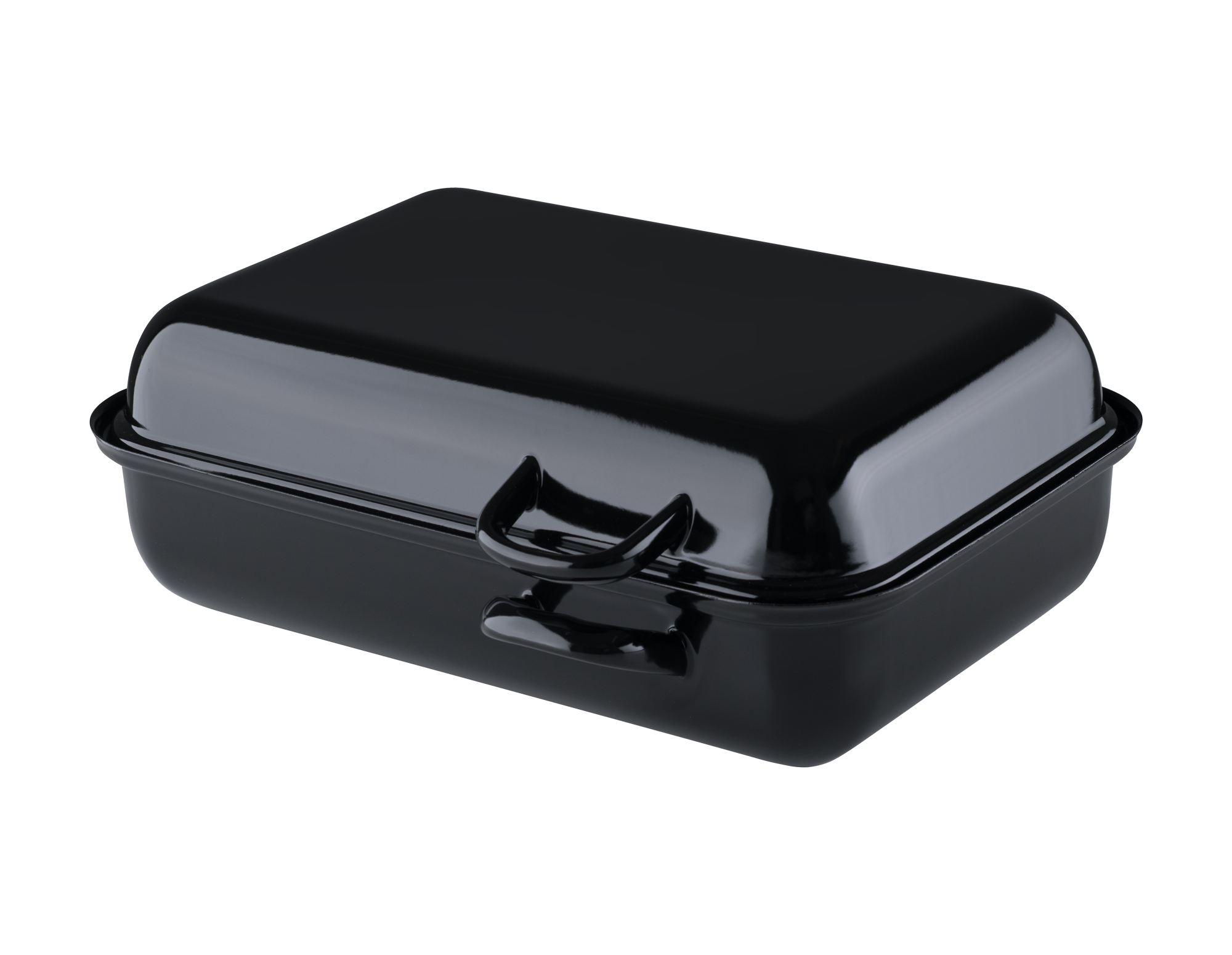 Our traditional enamel frying pan, with newly arranged handles, fits effortlessly into any oven. Many remember this frying pan for grandma's Sunday roast from the 'Bratenreindl'. With this frying pan with lid, you have the ideal roasting pan to braise meat for hours. The lid fits perfectly thanks to the fold in the lower baking dish part and also features two handles. It is strongly recommended to use pot holders when removing the lid. The roast can then be easily cut in the pan. After the meal, the enamel roaster is easy to clean. The enamel preserves the flavors and the lid keeps the liquid from escaping. The best part is that with this piece, you have two baking dishes in one: if the lid is not needed, it can serve as an additional baking and frying pan. In this frying pan with a lid, wonderful roasts and braised dishes are cooked perfectly. Both parts can also be used separately for sweet and savory casseroles and similar dishes.