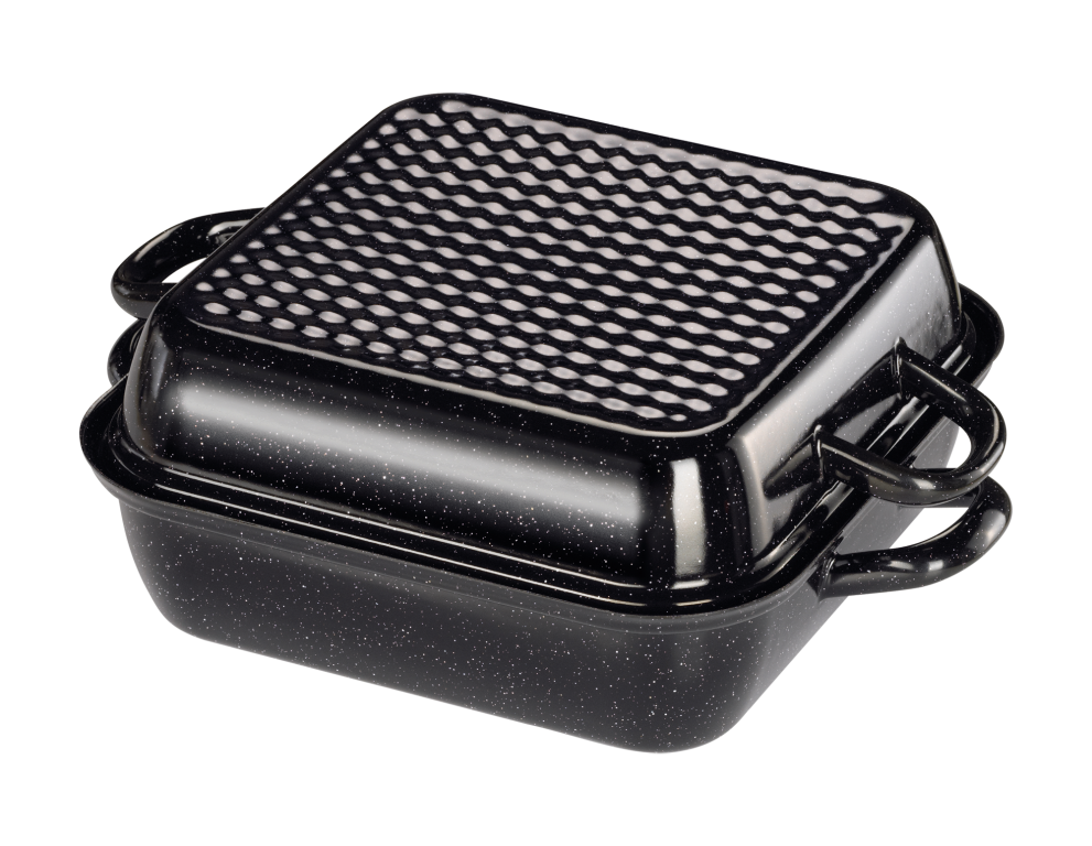 Our traditional enamel baking dish with two carrying handles and lid is now also available in a smaller, square version, ideal for small households. This baking dish reminds many of grandma's Sunday roast in the 'Bratenreindl'. With this baking dish, you can braise meat for hours. The lid fits perfectly thanks to the fold in the lower baking dish and also features two handles. When removing the lid, the use of pot holders is recommended. In the form, the roast can be cut directly, and after eating, the enamel baking dish is easy to clean. The enamel preserves the flavors and the lid keeps all liquid inside. The best part is that you get two baking dishes in one: when the lid is not needed, it can be used as an additional baking and roasting pan. Wonderful roasts and braised dishes are perfectly cooked in this baking dish with lid. Both parts can also be used separately for sweet and savory casseroles and similar dishes. If one part of the baking dish is used as a baking form, it should always be well-greased and dusted with flour or crumbs to prevent sticking and facilitate the removal of cakes and similar items.