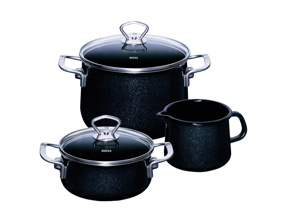 Our three-part dinnerware set from the Nouvelle series features modern design and an exciting mix of materials. The sealing boxes and pots in this set have ergonomically shaped stainless-steel handles in a modern design. The lids of the sealing boxes and pots are made of glass and equipped with stainless-steel handles. The strong steel heat-retention bottom ensures that heat is distributed evenly and quickly. Thanks to the good heat conduction of enamel, the pot walls also warm up all around, saving energy. The robust chrome rim prevents chipping of the enamel. Our enamel cookware is suitable for all types of stoves, including gas, electric, glass-ceramic, induction, and even open flame. Thanks to the iron core, heat is quickly conducted and retained, enabling sustainable and energy-efficient cooking.