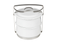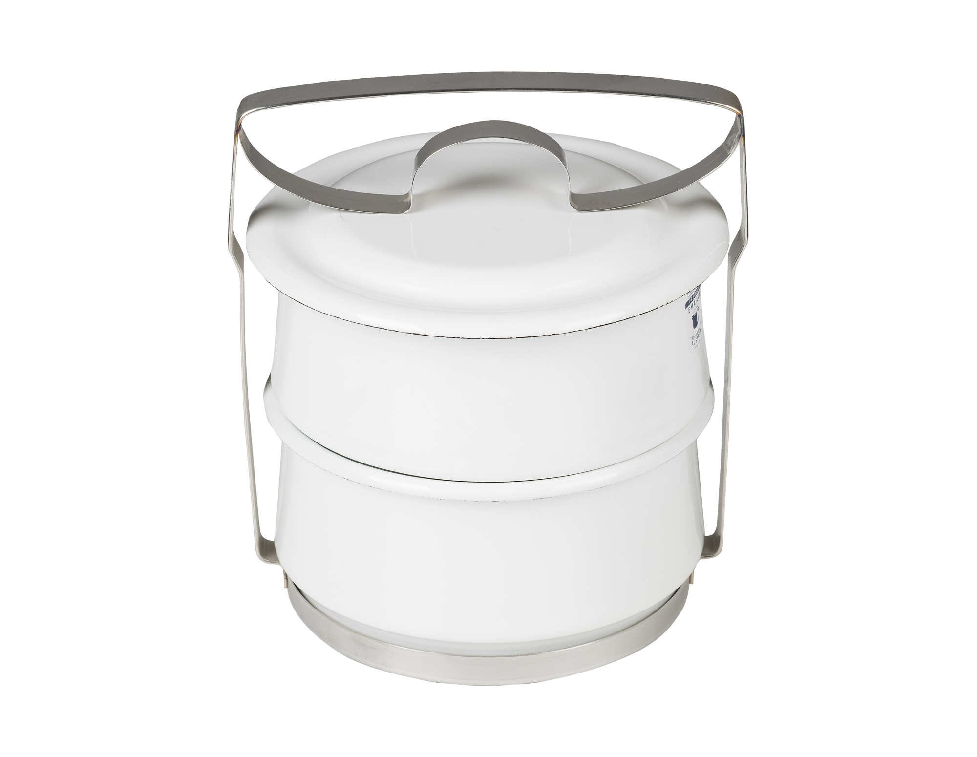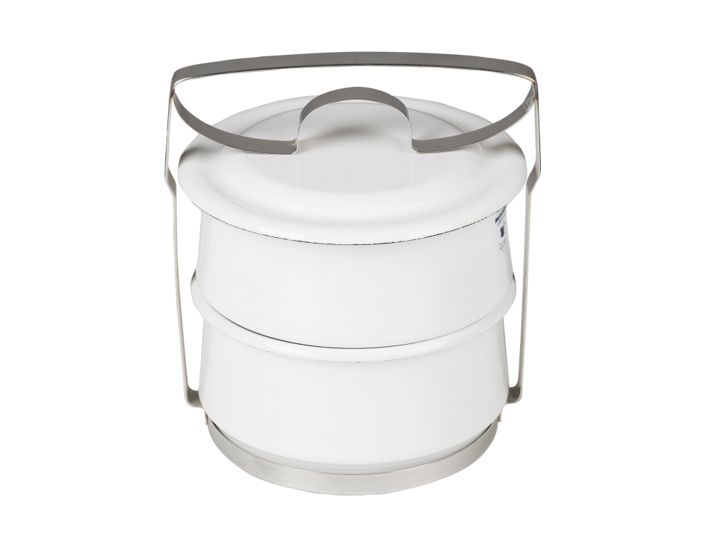 Unser Essensträger oder Henkelmann hilft Ihnen, Plastik zu vermeiden. Mit den stapelbaren Emaillebehältern können Sie das Essen von Ihrem Lieblingsrestaurant bequem nach Hause bringen und Ihre Lieblingsspeisen sicher und einfach überallhin transportieren. Ob ins Büro, zum Picknick oder zum Abendessen mit Freunden – die Speisen werden in die Aufbewahrungsdose gefüllt, mit der Eisenspange fest verschlossen und mit dem Griff mühelos transportiert. Emaille ist hervorragend für die Lagerung von Speisen geeignet. Die porenlose Oberfläche ist resistent gegenüber Fruchtsäuren und ist bakterien- und schmutzabweisend. Lebensmittel können hygienisch verwahrt werden und behalten ihren natürlichen Geschmack. Der Essensträger oder Henkelmann ist im klassischen Weiß erhältlich und kann mit zwei, drei oder vier Elementen erworben werden. Die Behälter haben einen Durchmesser von 14 cm.