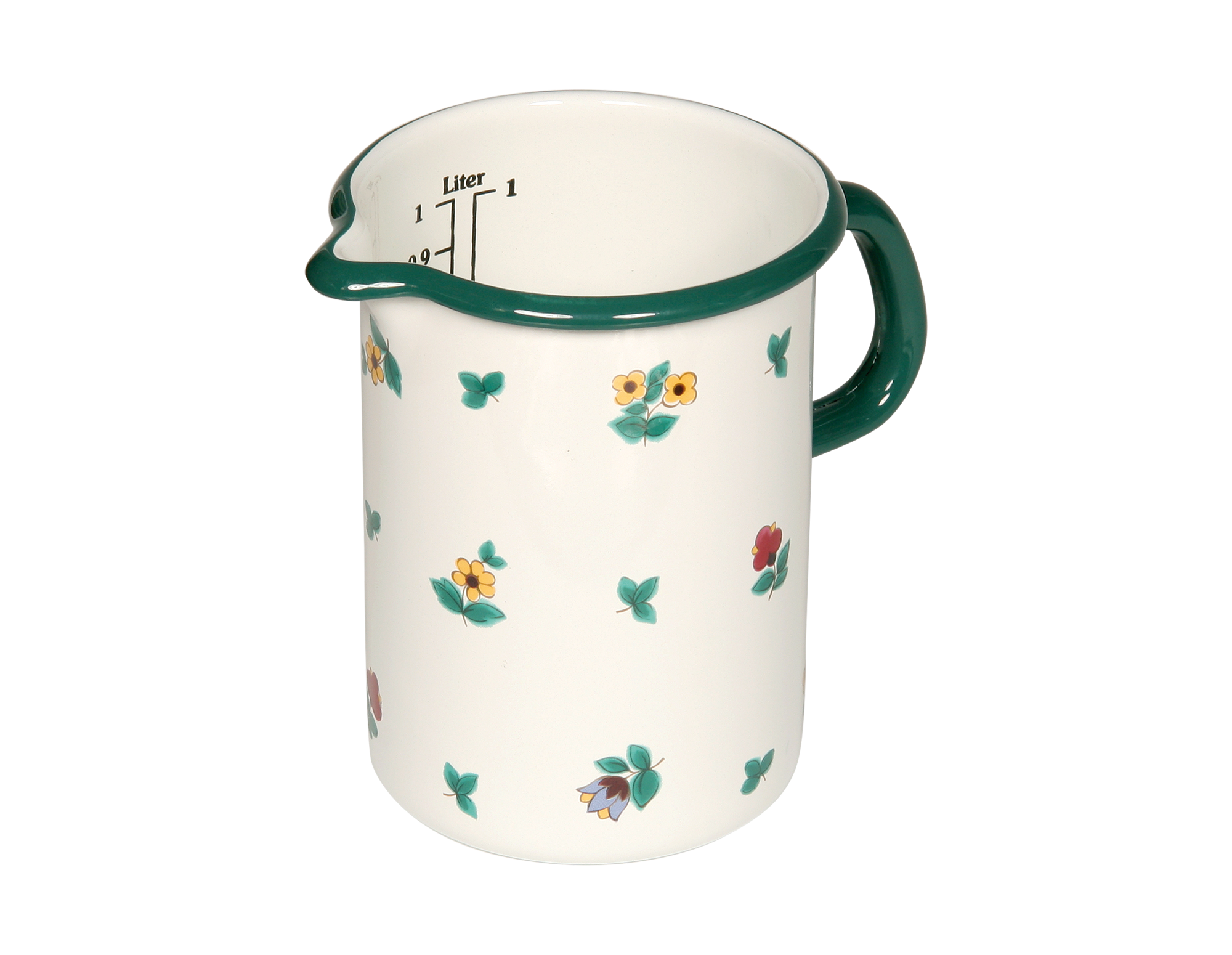Das Küchenmaß oder der Messbecher ist ein unverzichtbares Werkzeug zum Portionieren von Koch- und Backzutaten wie Mehl, Zucker, Milch, Wasser sowie anderen kalten oder heißen Flüssigkeiten. Im Inneren des Messbechers befinden sich zwei Skalen, die einmal Liter in Zentilitern und je nach Größe des Messbechers auch in 1/4 oder 1/8 Liter anzeigen – dies entspricht der traditionellen österreichischen Maßeinheit für Flüssigkeiten. Der Messbecher ist mit einem bequemen seitlichen Griff und einem Ausguss, genannt Schnabel, ausgestattet, der das Ausgießen von Flüssigkeiten erleichtert. Der Emaille-Messbecher eignet sich auch hervorragend zum Erwärmen von genau abgemessenen Flüssigkeiten wie Milch oder Wasser für den Hefeteig oder Suppe für Risotto. Es sollte jedoch mit kleiner Flamme gekocht werden, da der Durchmesser des Bodens sehr klein ist. Beim Erwärmen von Milch empfiehlt es sich, etwas Wasser hinzuzufügen, um Anbrennen zu verhindern.