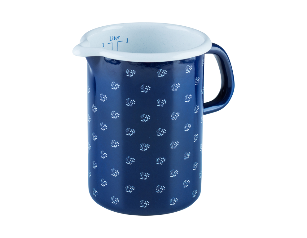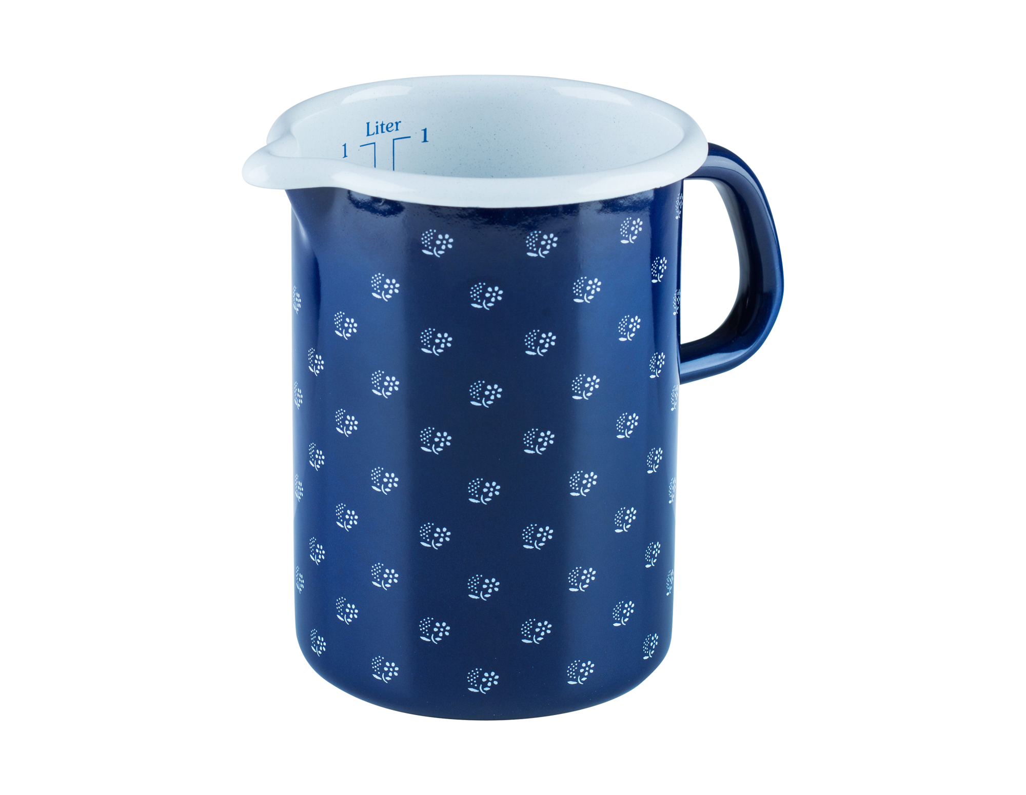 Das Küchenmaß oder der Messbecher ist ein unverzichtbares Werkzeug zum Portionieren von Koch- und Backzutaten wie Mehl, Zucker, Milch, Wasser sowie anderen kalten oder heißen Flüssigkeiten. Im Inneren des Messbechers befinden sich zwei Skalen, die einmal Liter in Zentilitern und je nach Größe des Messbechers auch in 1/4 oder 1/8 Liter anzeigen – dies entspricht der traditionellen österreichischen Maßeinheit für Flüssigkeiten. Der Messbecher ist mit einem bequemen seitlichen Griff und einem Ausguss, genannt Schnabel, ausgestattet, der das Ausgießen von Flüssigkeiten erleichtert. Der Emaille-Messbecher eignet sich auch hervorragend zum Erwärmen von genau abgemessenen Flüssigkeiten wie Milch oder Wasser für den Hefeteig oder Suppe für Risotto. Es sollte jedoch mit kleiner Flamme gekocht werden, da der Durchmesser des Bodens sehr klein ist. Beim Erwärmen von Milch empfiehlt es sich, etwas Wasser hinzuzufügen, um Anbrennen zu verhindern.
