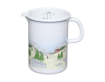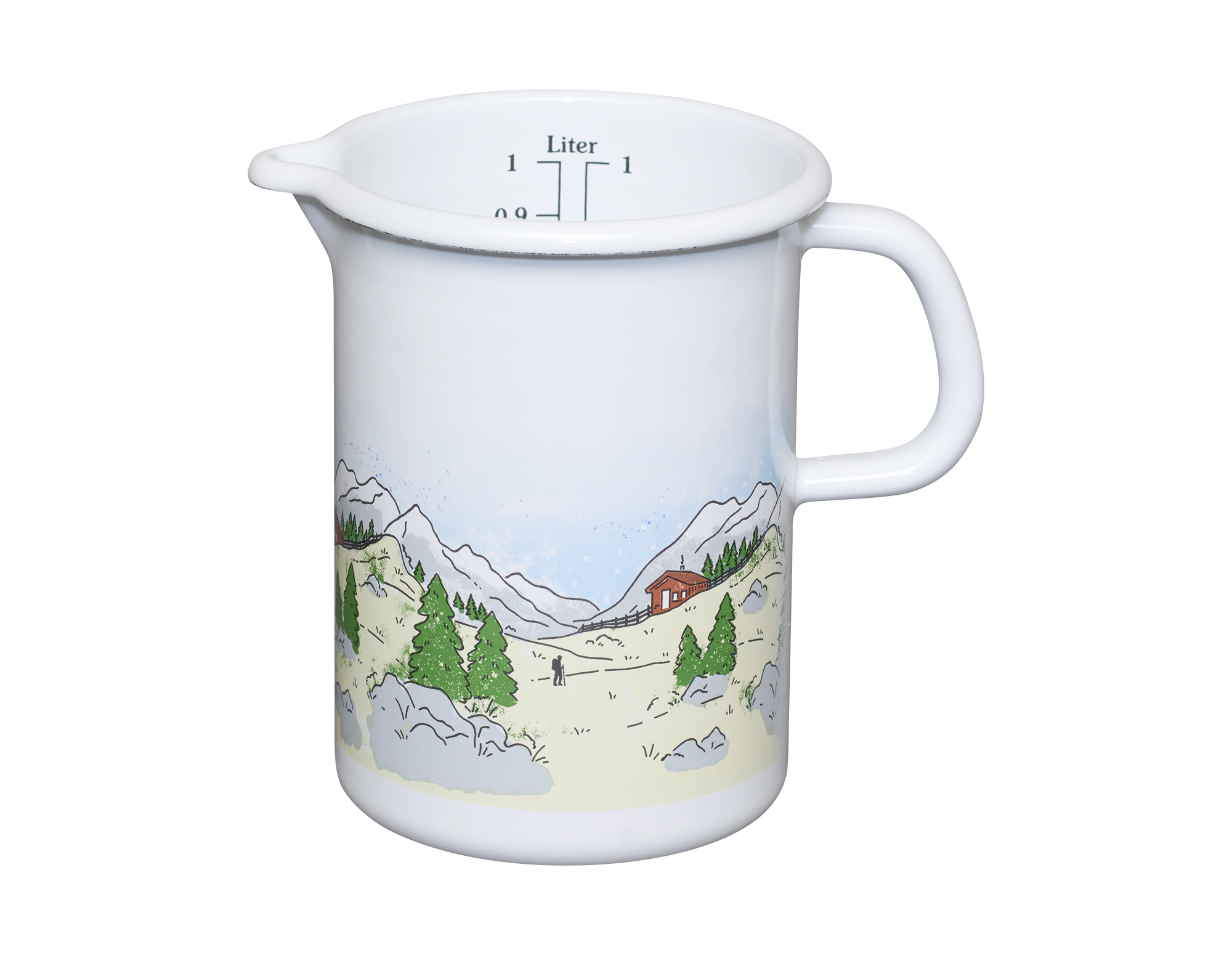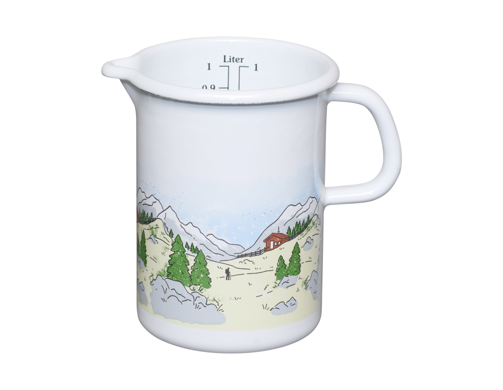 Das Küchenmaß oder der Messbecher ist ein unverzichtbares Werkzeug zum Portionieren von Koch- und Backzutaten wie Mehl, Zucker, Milch, Wasser sowie anderen kalten oder heißen Flüssigkeiten. Im Inneren des Messbechers befinden sich zwei Skalen, die einmal Liter in Zentilitern und je nach Größe des Messbechers auch in 1/4 oder 1/8 Liter anzeigen – dies entspricht der traditionellen österreichischen Maßeinheit für Flüssigkeiten. Der Messbecher ist mit einem bequemen seitlichen Griff und einem Ausguss, genannt Schnabel, ausgestattet, der das Ausgießen von Flüssigkeiten erleichtert. Der Emaille-Messbecher eignet sich auch hervorragend zum Erwärmen von genau abgemessenen Flüssigkeiten wie Milch oder Wasser für den Hefeteig oder Suppe für Risotto. Es sollte jedoch mit kleiner Flamme gekocht werden, da der Durchmesser des Bodens sehr klein ist. Beim Erwärmen von Milch empfiehlt es sich, etwas Wasser hinzuzufügen, um Anbrennen zu verhindern.