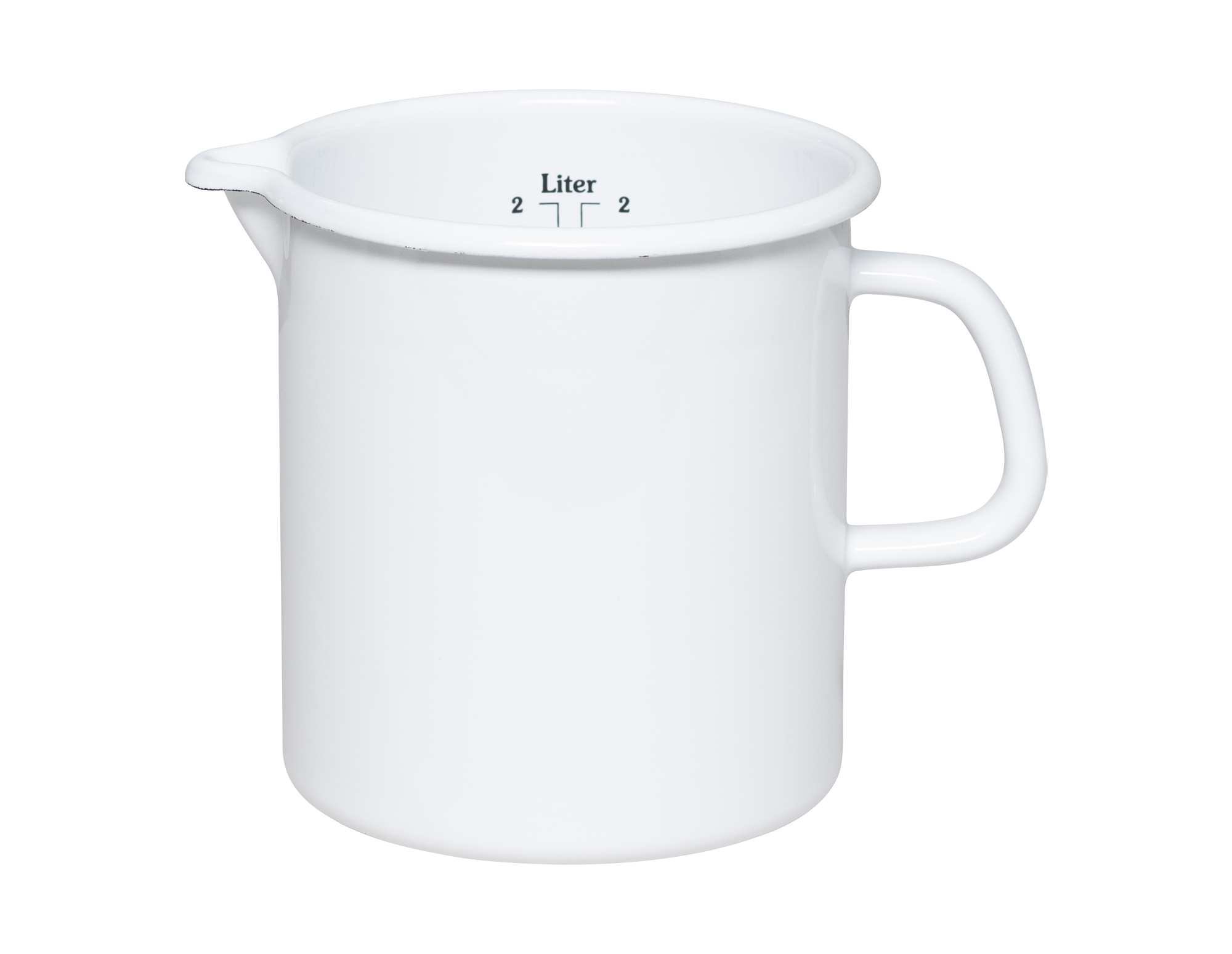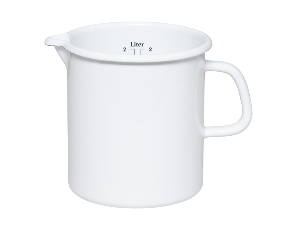 Das Küchenmaß oder der Messbecher ist ein unverzichtbares Werkzeug zum Portionieren von Koch- und Backzutaten wie Mehl, Zucker, Milch, Wasser sowie anderen kalten oder heißen Flüssigkeiten. Im Inneren des Messbechers befinden sich zwei Skalen, die einmal Liter in Zentilitern und je nach Größe des Messbechers auch in 1/4 oder 1/8 Liter anzeigen – dies entspricht der traditionellen österreichischen Maßeinheit für Flüssigkeiten. Der Messbecher ist mit einem bequemen seitlichen Griff und einem Ausguss, genannt Schnabel, ausgestattet, der das Ausgießen von Flüssigkeiten erleichtert. Der Emaille-Messbecher eignet sich auch hervorragend zum Erwärmen von genau abgemessenen Flüssigkeiten wie Milch oder Wasser für den Hefeteig oder Suppe für Risotto. Es sollte jedoch mit kleiner Flamme gekocht werden, da der Durchmesser des Bodens sehr klein ist. Beim Erwärmen von Milch empfiehlt es sich, etwas Wasser hinzuzufügen, um Anbrennen zu verhindern.