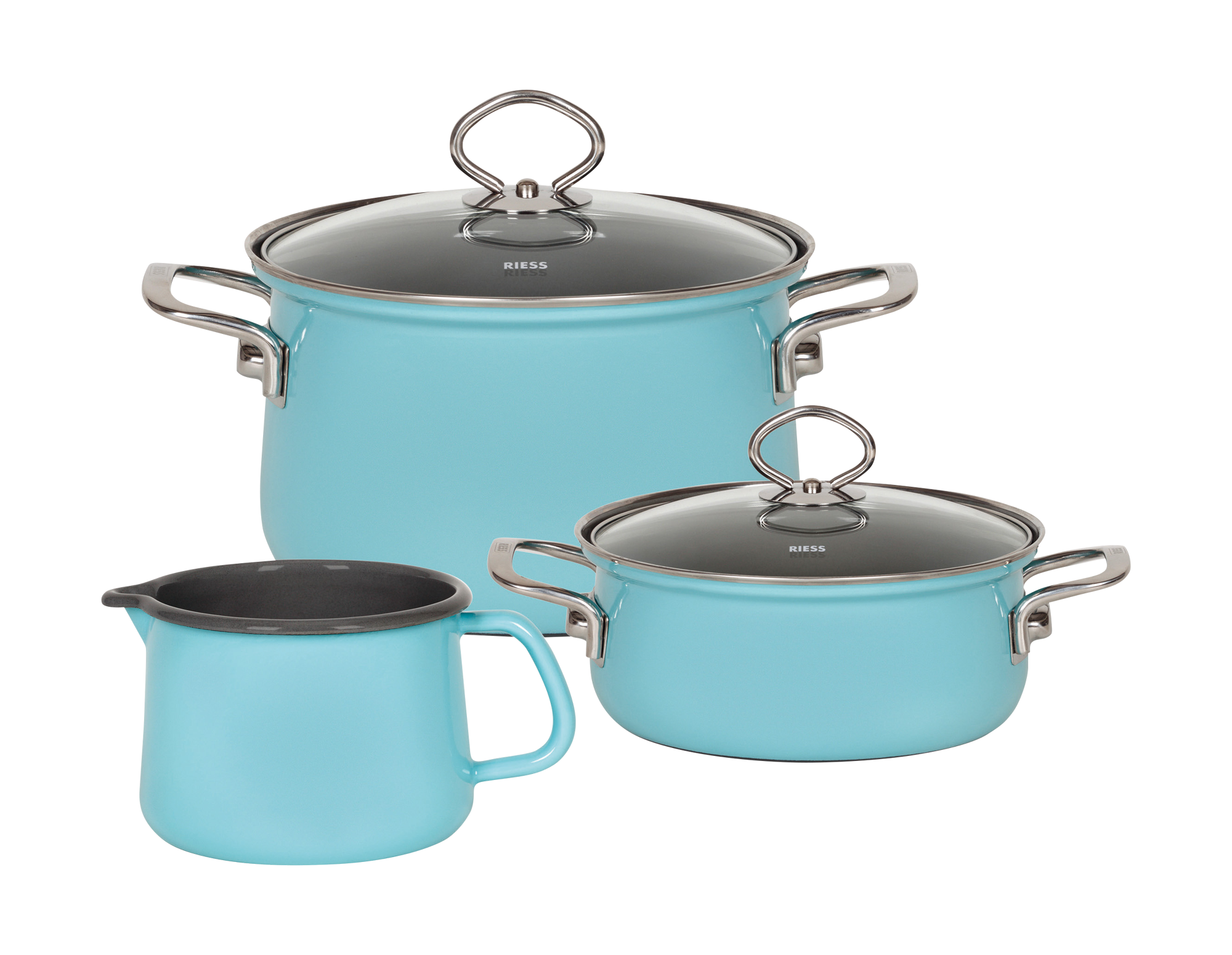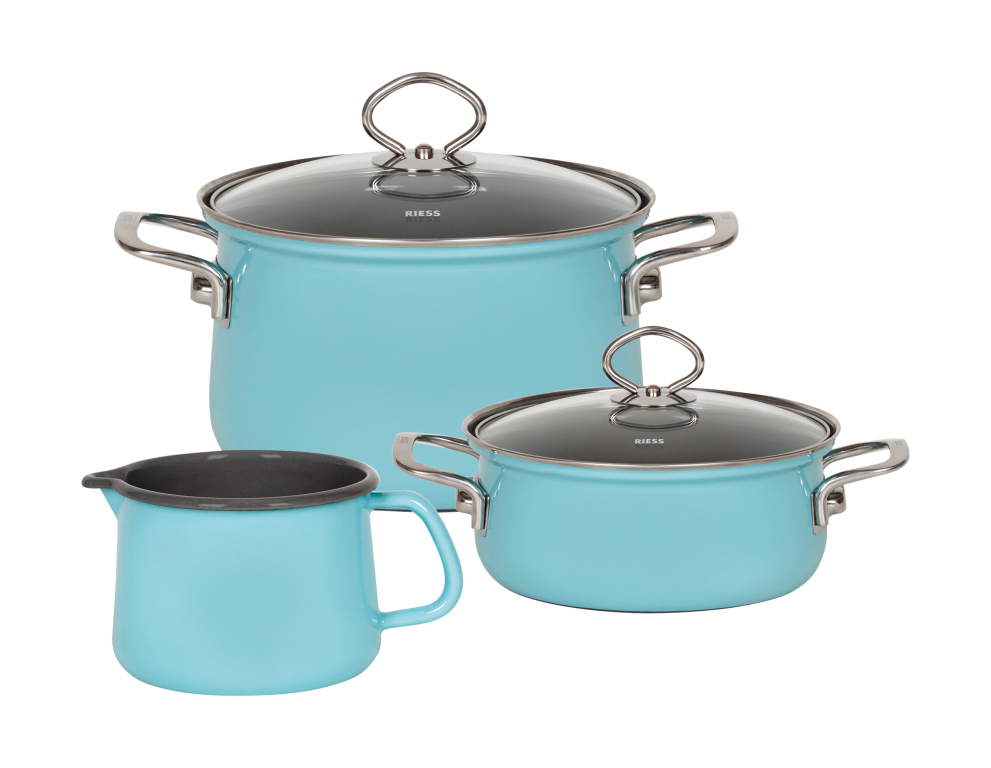 Unser dreiteiliges Geschirrset der Nouvelle Serie besticht durch modernes Design und einen spannenden Materialmix. Die Kasserollen und Kochtöpfe dieses Sets haben handlich geformte Edelstahlgriffe im modernen Design. Die Deckel der Kasserollen und Töpfe sind aus Glas und mit Edelstahlgriffen versehen. Der starke Stahl-Wärmespeicherboden sorgt dafür, dass sich die Wärme gleichmäßig und schnell verteilt. Dank der guten Wärmeleitung von Emaille werden auch die Topfwände rundum warm, was Energie spart. Der robuste Chromrand verhindert das Abschlagen der Emaille. Unser Kochgeschirr aus Emaille ist für alle Herdarten geeignet, einschließlich Gas, Elektro, Glaskeramik, Induktion und sogar offenes Feuer. Dank des Eisenkerns wird die Wärme schnell geleitet und gespeichert, was nachhaltiges und energiesparendes Kochen ermöglicht.