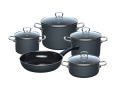 Der edle Grauton verleiht jeder Küche eine moderne, stilvolle Note und sieht am Tisch gut aus. Die Emailletöpfe und -kasserollen haben eine klassische zylindrische Form, rostfreien Schüttrand, Edelstahlgriffe und Glasdeckel. Der extra starke Stahl-Wärmespeicherboden gewährleistet besonders energieeffizientes Kochen.
