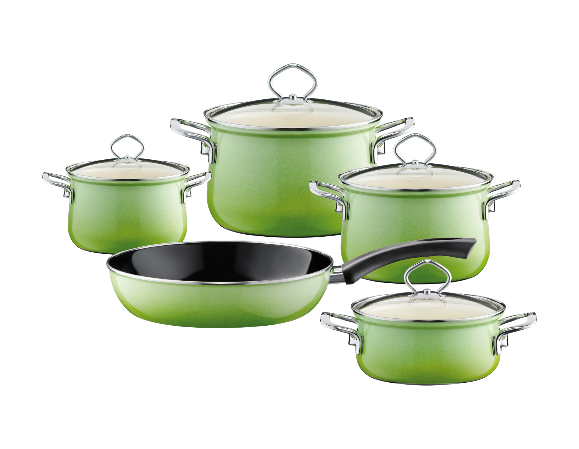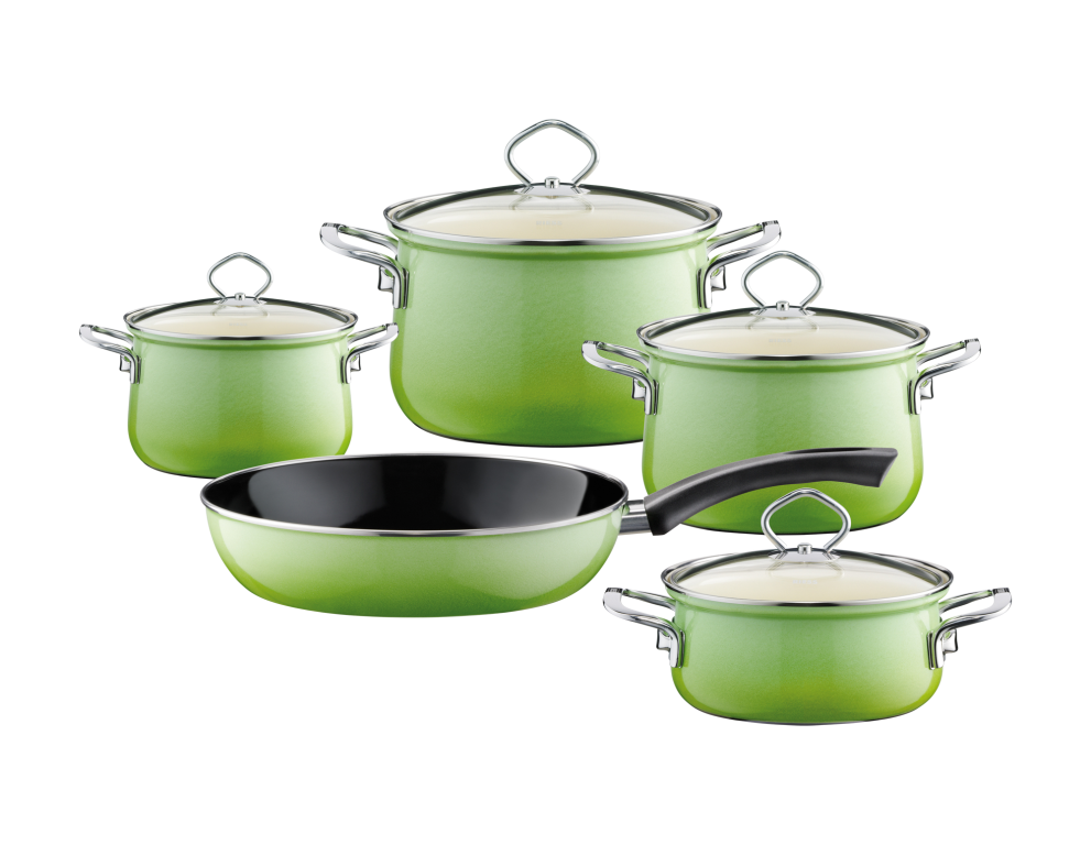 Unsere Geschirrset der Nouvelle Serie besticht durch modernes Design und einem spannenden Materialmix. Die Kasserollen und Kochtöpfe des Topfsets haben handlich geformte Edelstahlgriffe in modernem Design, die Pfanne einen ergonomischen Kunststoffgriff. Die Deckel der Kasserollen und Töpfe sind aus Glas und haben ebenfalls einen Edelstahlgriff. Der starke Stahl- Wärmespeicherboden sorgt dafür, dass sich die Wärme gleichmäßig und rasch verteilt. Dank der guten Wärmeleitung Emaille werden auch die Topfwände rundum warm, das spart Energie. Der robuste Chromrand verhindert das Abschlagen. Unser Kochgeschirr aus Emaille kann auf allen Herdarten (Gas, Elektro, Glaskeramik, Induktion und sogar über offenem Feuer) verwendet werden. Dank des Eisenkerns wird die Wärme schnell geleitet und dann gespeichert: für nachhaltiges, energiesparendes Kochen.
