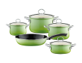 Der Farbton Smaragd ist meisterhaft emailliert in sanften Grün Schattierungen. Töpfe und Kasserollen sind mit starkem Stahl-Wärmespeicherboden, rostfreiem Schüttrand, Edelstahlgriffen und Glasdeckel ausgestattet.