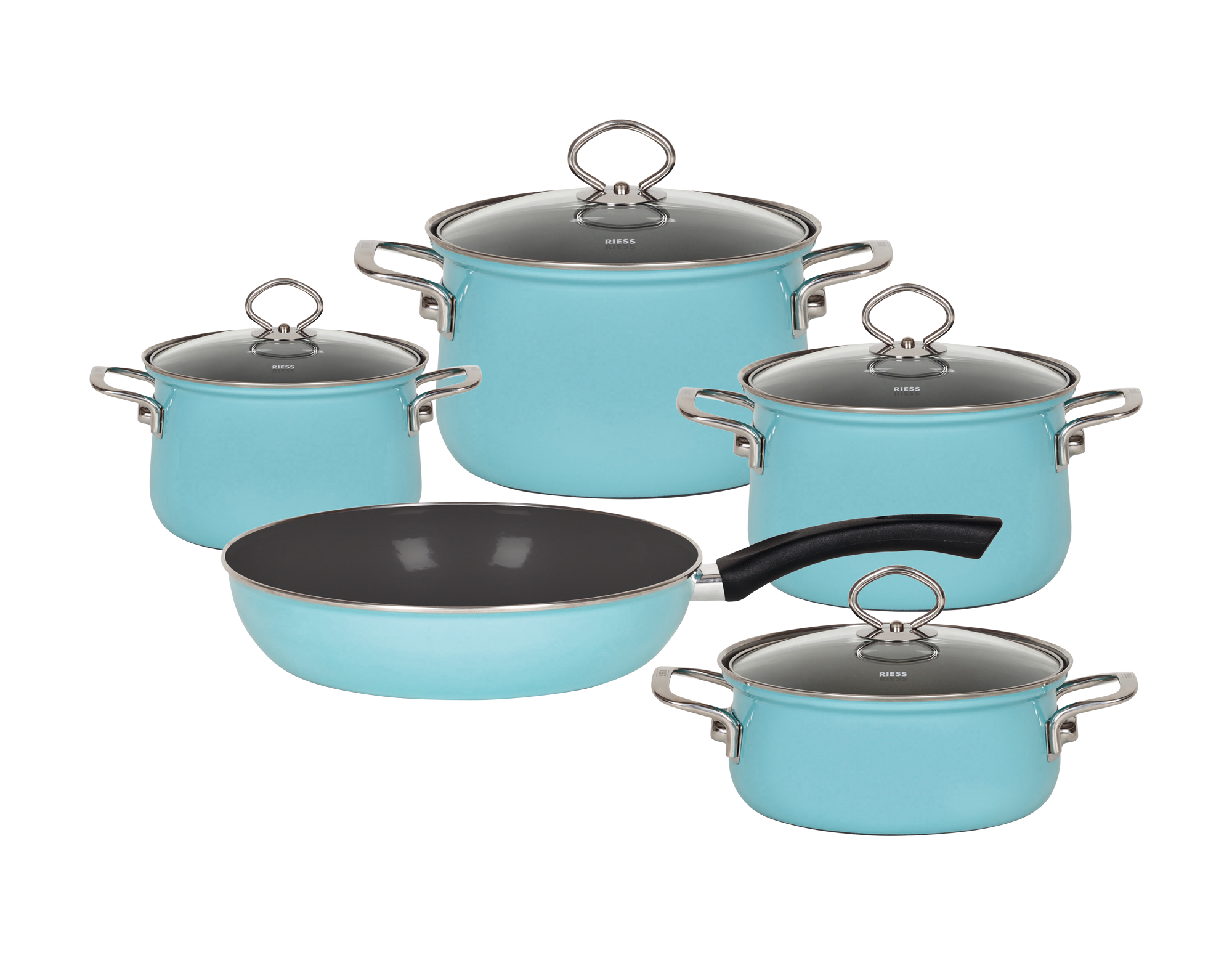 Unsere Geschirrset der Nouvelle Serie besticht durch modernes Design und einem spannenden Materialmix. Die Kasserollen und Kochtöpfe des Topfsets haben handlich geformte Edelstahlgriffe in modernem Design, die Pfanne einen ergonomischen Kunststoffgriff. Die Deckel der Kasserollen und Töpfe sind aus Glas und haben ebenfalls einen Edelstahlgriff. Der starke Stahl- Wärmespeicherboden sorgt dafür, dass sich die Wärme gleichmäßig und rasch verteilt. Dank der guten Wärmeleitung Emaille werden auch die Topfwände rundum warm, das spart Energie. Der robuste Chromrand verhindert das Abschlagen. Unser Kochgeschirr aus Emaille kann auf allen Herdarten (Gas, Elektro, Glaskeramik, Induktion und sogar über offenem Feuer) verwendet werden. Dank des Eisenkerns wird die Wärme schnell geleitet und dann gespeichert: für nachhaltiges, energiesparendes Kochen.