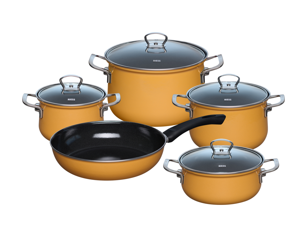 Unsere Geschirrset der Nouvelle Serie besticht durch modernes Design und einem spannenden Materialmix. Die Kasserollen und Kochtöpfe des Topfsets haben handlich geformte Edelstahlgriffe in modernem Design, die Pfanne einen ergonomischen Kunststoffgriff. Die Deckel der Kasserollen und Töpfe sind aus Glas und haben ebenfalls einen Edelstahlgriff. Der starke Stahl- Wärmespeicherboden sorgt dafür, dass sich die Wärme gleichmäßig und rasch verteilt. Dank der guten Wärmeleitung Emaille werden auch die Topfwände rundum warm, das spart Energie. Der robuste Chromrand verhindert das Abschlagen. Unser Kochgeschirr aus Emaille kann auf allen Herdarten (Gas, Elektro, Glaskeramik, Induktion und sogar über offenem Feuer) verwendet werden. Dank des Eisenkerns wird die Wärme schnell geleitet und dann gespeichert: für nachhaltiges, energiesparendes Kochen.