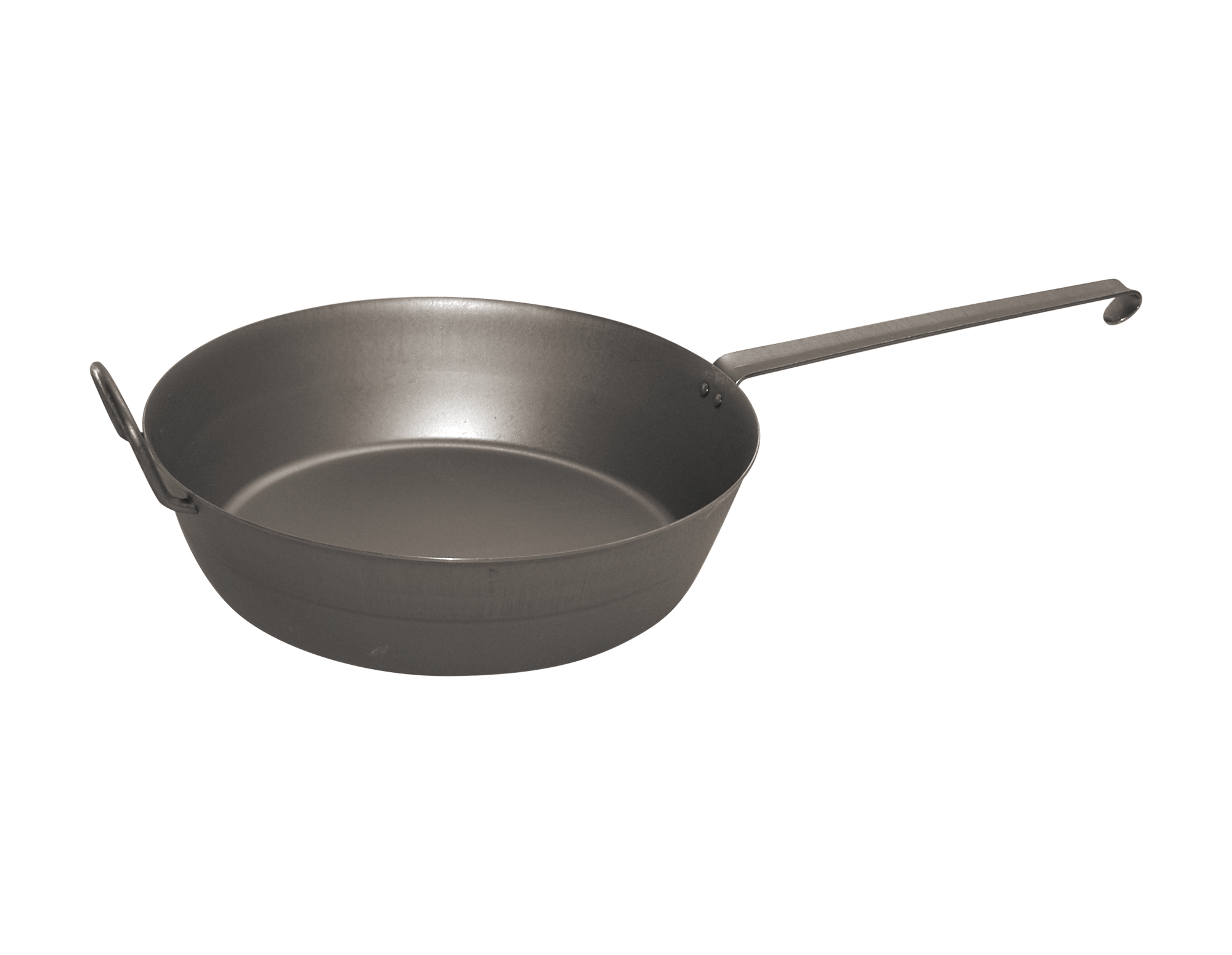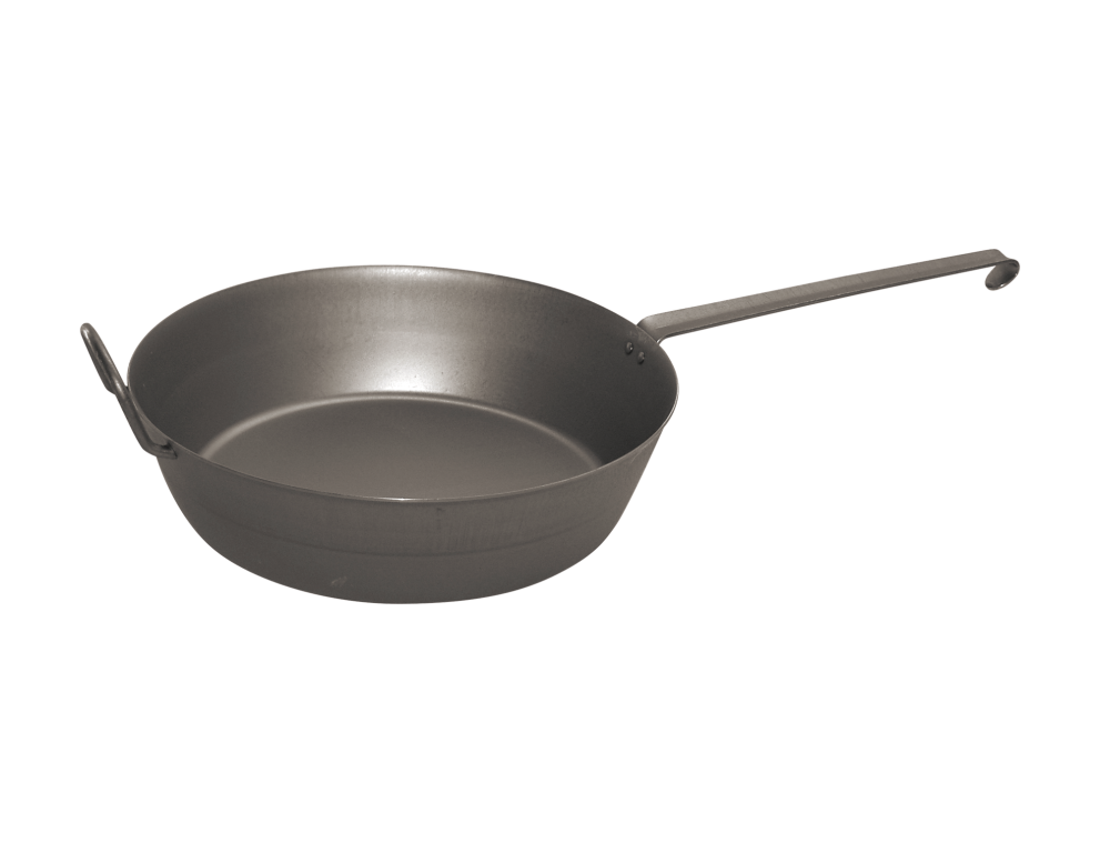 Unsere Eisenpfannen werden kaltgeschmiedet, indem eine ausgestanzte Stahlblechscheibe unter hohem Druck in eine Tiefziehform gepresst wird. An den Pfannenkörper wird ein Stiel befestigt, der immer eine Aufhängevorrichtung hat, damit die Pfanne wie früher üblich hängend aufbewahrt werden kann. Eisenpfannen sind bei Köchen nicht nur wegen ihres rustikalen Aussehens beliebt, sondern vor allem wegen ihrer exzellenten Brateigenschaften. Dank der schnellen Wärmeleitung von Eisen sind sie ideal zum scharfen Anbraten, was Bratkartoffeln und Fleisch besonders knusprig macht. Oft wird die Eisenpfanne auch als Servierpfanne verwendet, häufig in Verbindung mit dem „Pfannenknecht“ oder einem runden Brett als Pfannenuntersetzer. Mit der Zeit verbessert sich die Funktion der Pfanne durch die Bildung einer Patina, die durch die poröse Struktur der Pfanne entsteht und als Korrosionsschutz dient. Mit richtiger Pflege, um Rostbildung zu vermeiden, sind RIESS Eisenpfannen treue Begleiter für viele kulinarische Abenteuer. Neben der klassischen Verwendung für Bratkartoffeln, Fleisch oder Nockengerichte kann die Eisenpfanne für alle Gerichte genutzt werden, die eine Pfanne erfordern. Vor dem ersten Gebrauch muss die Wachsschicht, die als Rostschutz dient, mit heißem Wasser entfernt und die Pfanne eingebrannt werden. Nach Gebrauch sollte die Pfanne niemals in den Geschirrspüler gegeben werden. Stattdessen einfach mit einem Küchentuch auswischen. Bei starker Verkrustung mit Wasser, Salz und Bürste reinigen und dann auf der warmen Herdplatte gut trocknen lassen.