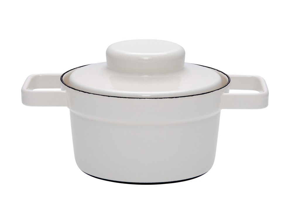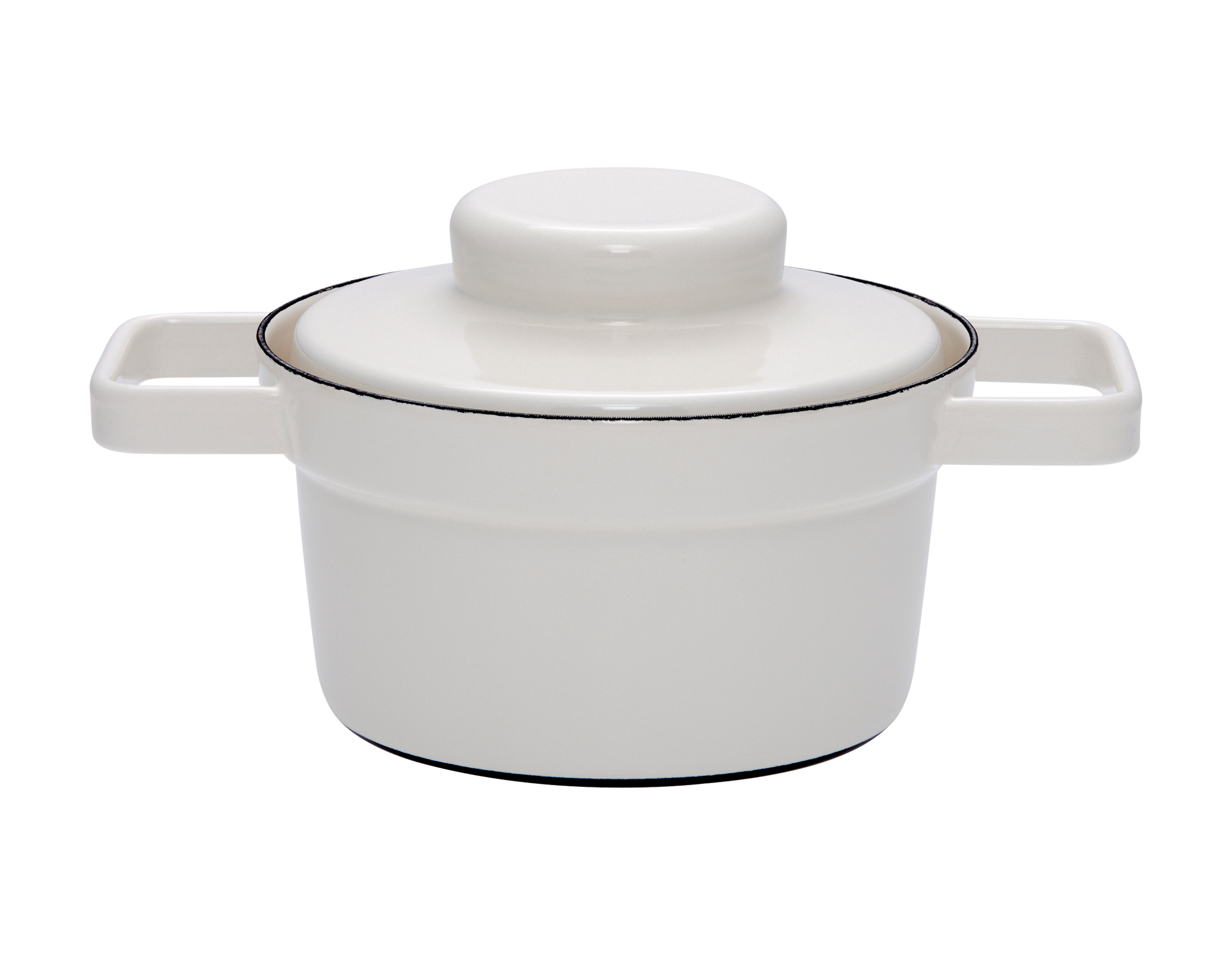 Die konische Form der Aromapots macht die Serie stapelbar – ineinander und aufeinander – damit wird Platz gespart. Während des Kochens fungiert der Deckel, umgedreht und beiseitegestellt, auch als Zwischenablage, Schüssel oder Teller für Zutaten, Kochlöffel & Co. Später am Tisch übernimmt er die Aufgabe des Untersetzers.