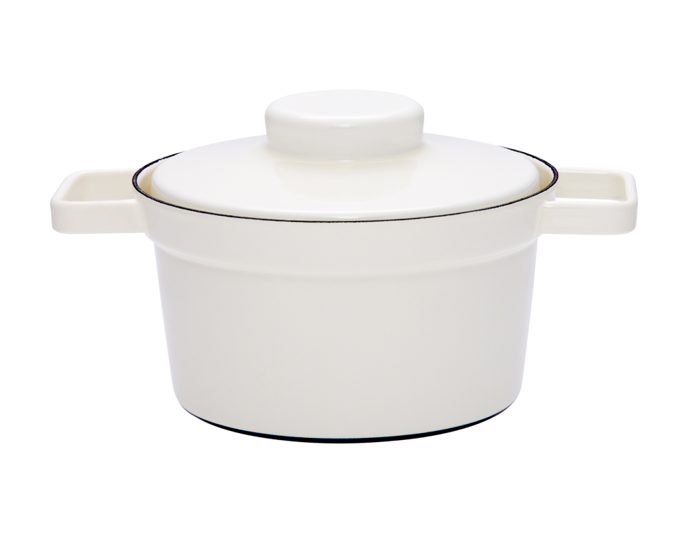 Die konische Form der Aromapots macht die Serie stapelbar – ineinander und aufeinander – damit wird Platz gespart. Während des Kochens fungiert der Deckel, umgedreht und beiseitegestellt, auch als Zwischenablage, Schüssel oder Teller für Zutaten, Kochlöffel & Co. Später am Tisch übernimmt er die Aufgabe des Untersetzers.