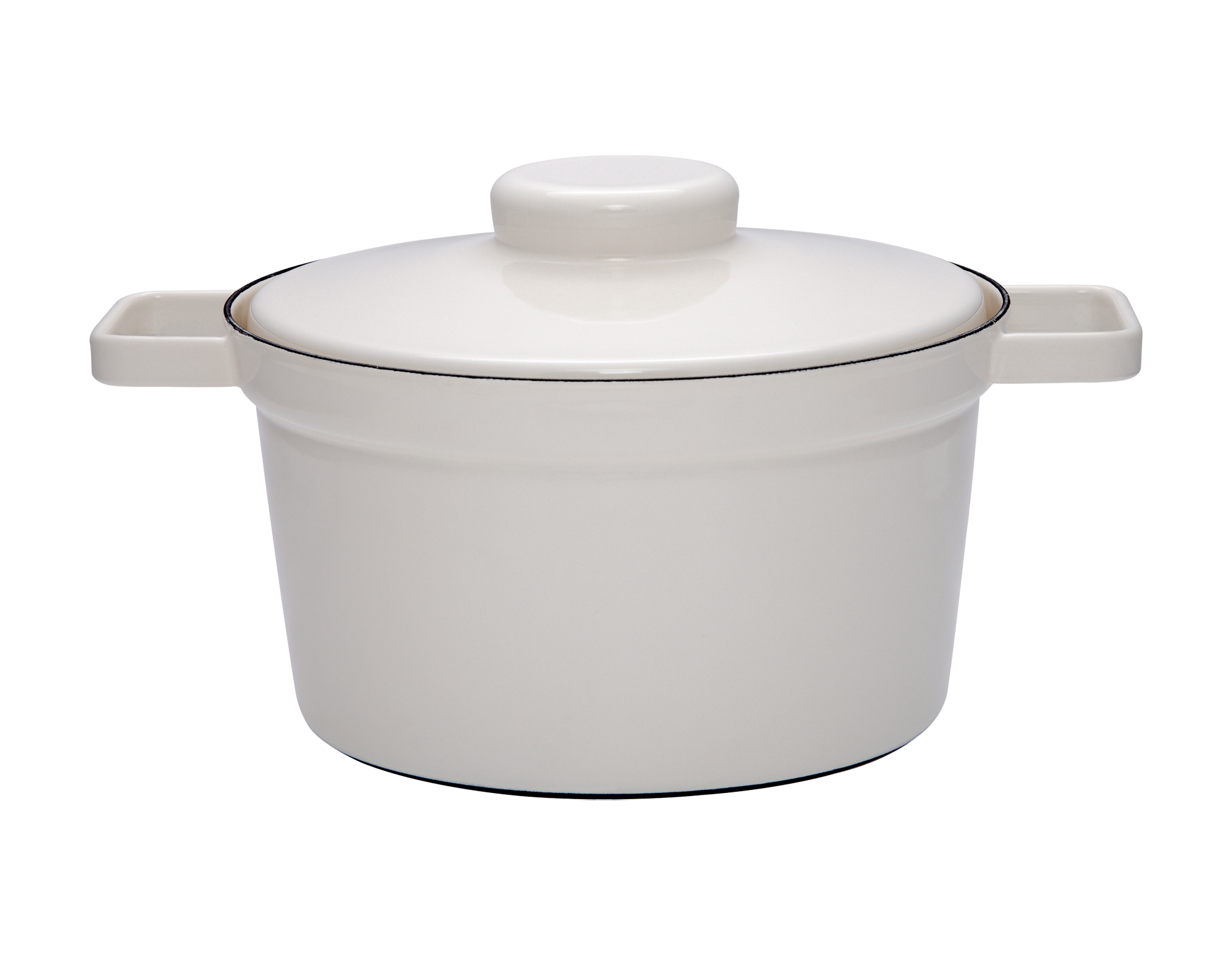 Die konische Form der Aromapots macht die Serie stapelbar – ineinander und aufeinander – damit wird Platz gespart. Während des Kochens fungiert der Deckel, umgedreht und beiseitegestellt, auch als Zwischenablage, Schüssel oder Teller für Zutaten, Kochlöffel & Co. Später am Tisch übernimmt er die Aufgabe des Untersetzers.